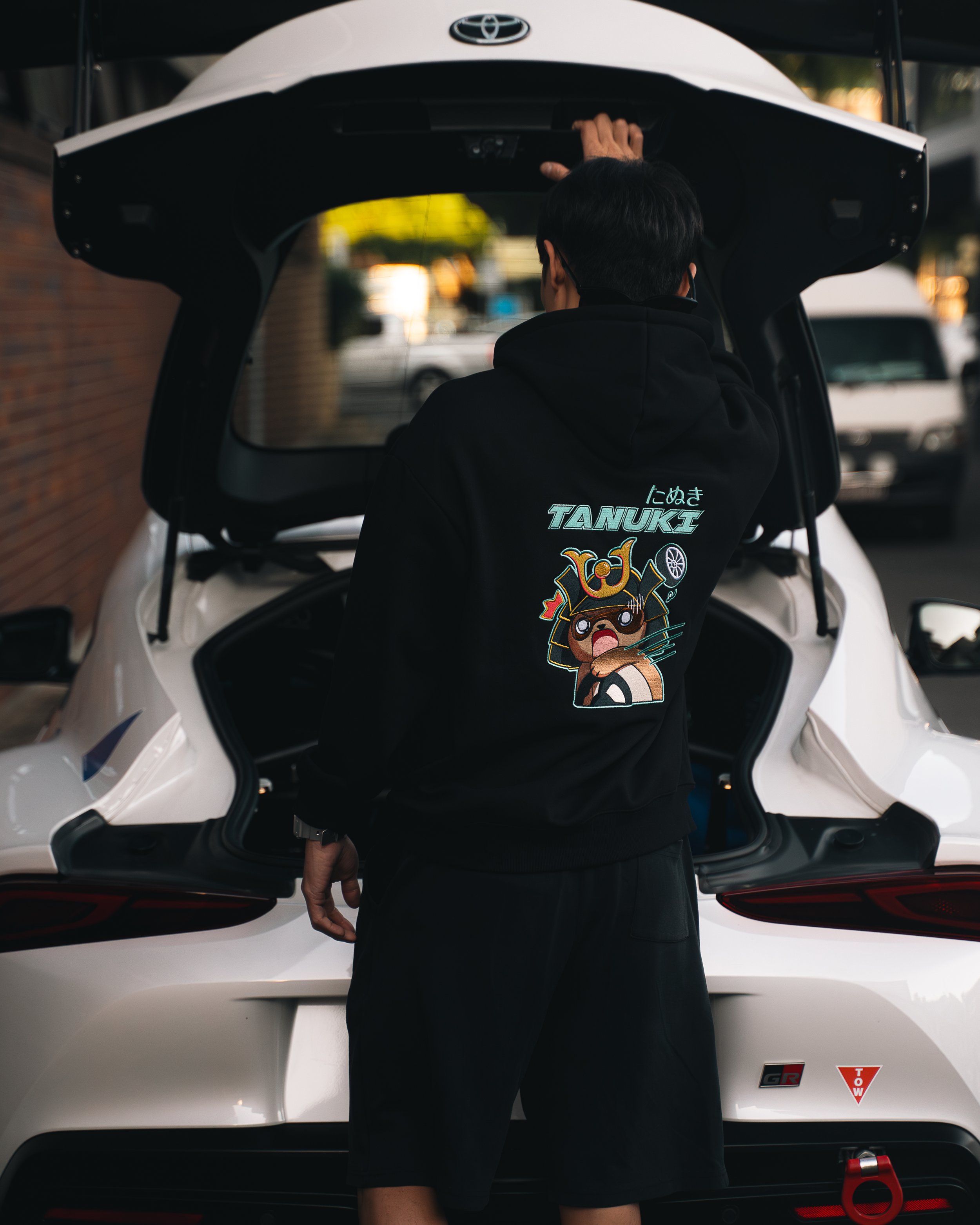 Showcasing the iconic TANUKI logo on the front. The back, however, tells a different story—our mascot captured in a moment of pure chaos, with a wheel flying off at WTAC2023
